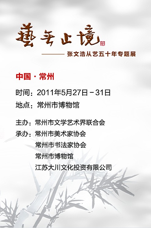 由常州市文学艺术界联合会主办,常州市美术家协会,常州市书法家协会,常州市博物馆承办,江苏大川文化投资有限公司协办的“艺无止境——张文浩从艺五十年专题展”将于2011年5月27日至5月31日在常州市博物馆举行。