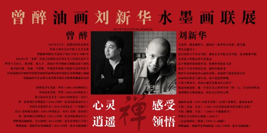 曾醉油画、刘新华水墨画联展将于2011年7月23日下午于北京可创铭佳画廊开幕。曾醉毕业于西安美术学院工艺美术系,曾长期从事美术编辑工作,现为专业画家,对中国的传统文化氛围有着天然的爱好和留恋,多年来对中国的艺术精神进行过深入的研究和体悟,并把中国玄妙的艺术精神融入油画创作,从而使其作品进入自由自在的精神逍遥境界;刘新华现为通讯社《新华每日电讯》报美编,曾先后就读于武汉纺织大学美术学院、湖北艺术学院美术学院、北京服装学院,他的水墨作品注重对生活的感受和领悟,主张用心画画、轻松自在、宁拙勿巧,做一个精神世界的放飞者。曾醉和刘新华二位画家分别用油画和水墨画两种不同的绘画材料和语言去表现人们内心所共同追求的自由和真诚,想必在这个燥动的夏季能给人们带来些许轻松和清凉。