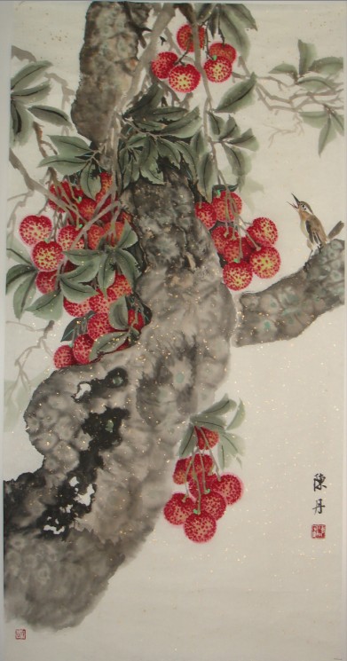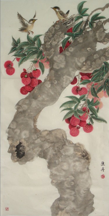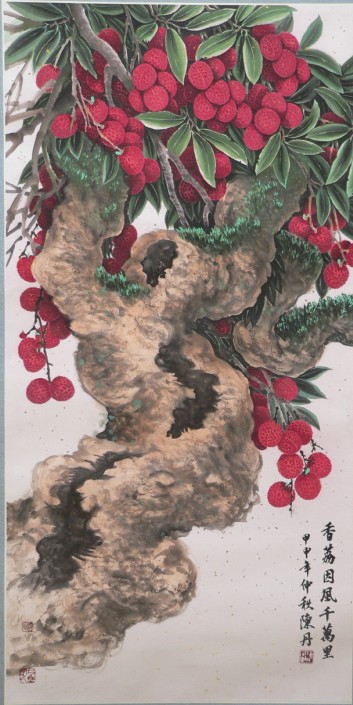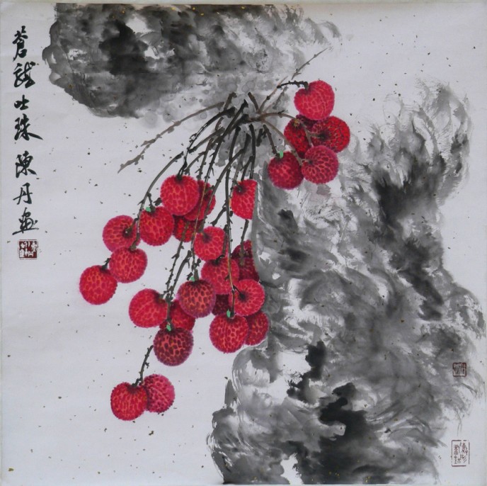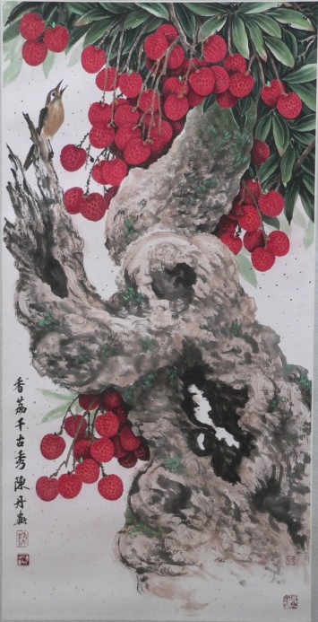 陈丹对画荔枝有其独到的审美观,他的作品形神兼备、润厚鲜明、气韵清纯、豪迈大气、清劲灵动,透射出强烈的艺术个性,开创了荔枝画人文内涵的新视野。为画好荔枝曾先后不辞辛苦地去到广东增城西园“挂绿”古荔、广东新兴县“六祖手植千年古荔”、以及稔村镇荔枝林、广西灵山县塘坡村古荔林和大芦村古荔林、谭家营古荔林、广东观音山下七星围村古荔林等实地,对荔枝的形、色、神、韵进行长期的观察、写生、积累对比,而后对鲜有人关注的古荔树倾注极大的心血,创作出来的古荔树将其历古经今百折不挠的生命力、象征中华民族自强不息的精神气魄表现得淋漓尽致,揭示出荔枝文化的深厚底蕴。陈丹积累素材广泛,自酿家数,创立出了一套能够充分展现荔枝艺术特征和神韵的独特技法,将荔枝文化理念提高到一个全新的角度和层次。