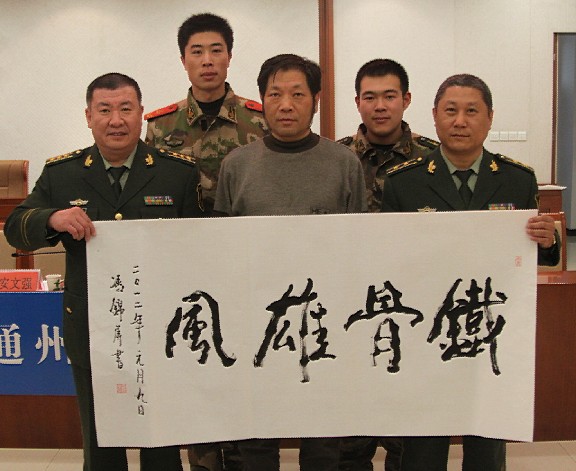 联合国世界和平教育奖章获得者、书画家冯锦屏先生(中)为官兵题写“铁骨雄风”。