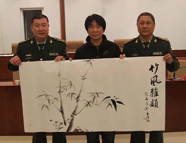 东方大学传统书画学院院长王颜钧(中)创作墨竹,并与政委安文强(左)、副支队长赵宏利(右)合影留念。