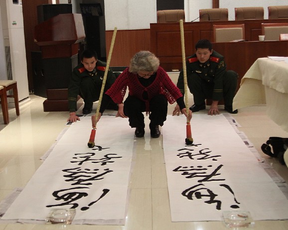 赵启棣老师多年的拥军经历,其身影在官兵们心目中早已再熟悉不过了。但是她的“绝活”——双手同时执笔在宣纸上书写同样的句子,还是赢得了满堂喝彩。