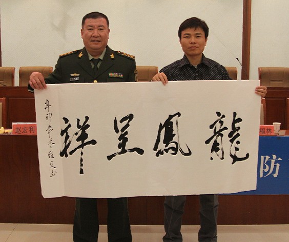 中国国家艺术网总编辑、书法家钟文(右)创作“龙凤呈祥”作品,并与政委安文强合影留念。