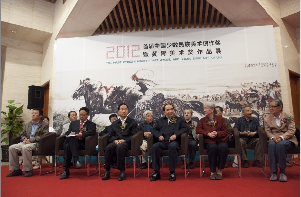中国国家艺术网讯(钟文 报道):由中央民族大学、黄胄美术基金会、炎黄艺术馆共同主办的“首届中国少数民族美术创作奖暨黄胄美术奖作品展”于2012年9月29日上午9点30分在北京炎黄艺术馆隆重开幕。参加评奖活动及出席开幕式的领导有:全国政协副主席阿布来提·阿不都热西提;最高人民检察院原检察长贾春旺;中国美协主席刘大为;中央文史馆画院院长马振声;中央民族大学校长陈理;中央民族大学美术学院院长殷会利;黄胄美术基金会理事长梁缨等相关领导。炎黄艺术馆理事长、黄胄先生夫人郑闻慧女士;原中央工艺美术学院院长常莎娜教授;以及著名美术家周秀青、徐希、李魁正、史国良等;著名理论家陈池瑜等参加开幕式。展览持续到10月5日。