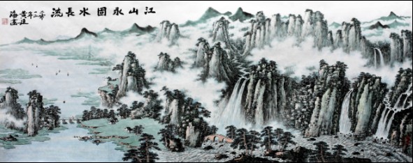 <江山永固水长流>高1.44米,宽3.64米,该画以崭新的艺术语境和雄健苍润的笔墨,描绘了群山烟岚、劲松飞瀑、江湖渔帆和村居人家,歌颂了祖国山河的壮丽与秀美,给人以气壮山河、荡气回肠的豪迈气慨!出色的再现了江山永固水长流这一主题。这是继傅抱石大师<江山如此多娇>之后,江苏山水画家为人民大会堂奉献的力作之一。