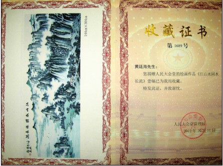 为庆祝党的十八大,应北京人民大会堂管理局的邀请,当代著名山水画家黄廷海经月余的精心创作,最近完成了巨幅山水画<江山永固水长流>,经严格的审查通过,近日在人民大会堂举行了捐赠接收仪式,颁发了收藏证书。