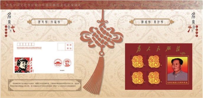 经国家邮政部门审批为我国文化事业做出卓越成就的文化名家专门设计、印制纪念封一枚。该纪念封首次采用了特殊工艺精制而成,极具鉴赏和收藏价值。 北京道德经艺术馆邮票珍藏册4月15日到货,4月16日接受订购。见博客首页通知。