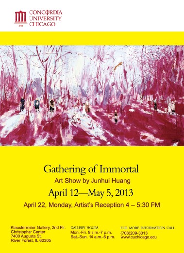 中国国家艺术网讯:2013年4月12日,神仙会-黄君辉艺术展在美国芝加哥klaustermeier青年艺术家画廊隆重开展,展览将延续至2013年5月6日。本次活动由芝加哥康考迪亚大学策划主办,展览展出黄君辉近期精心创作的《神仙会》组画33幅。