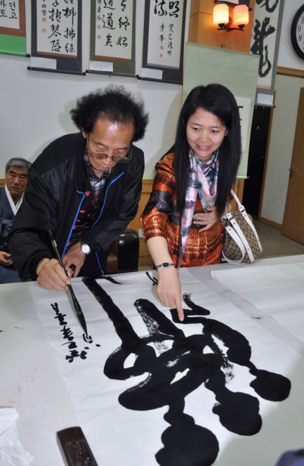 交流展在友好和谐的气氛中进行,展厅挂满的作品涵盖了水墨、青绿、冰雪、彩墨、焦墨、烙烫等多种山水、人物、花鸟表现形式,中韩的书法作品特色鲜明,受到了参观者的好评。中国国际书画艺术协会主席张世芝女士向韩国代表赠送根雕作品《中韩情》,韩国回赠珍贵的茶叶;华夏张氏书画院秘书长张一臣和韩国碑林协会会长金善源分别代表中韩两国讲了话,“艺术无国界,中韩情谊浓”大家都表示今后增加双方文化领域的交流合作。