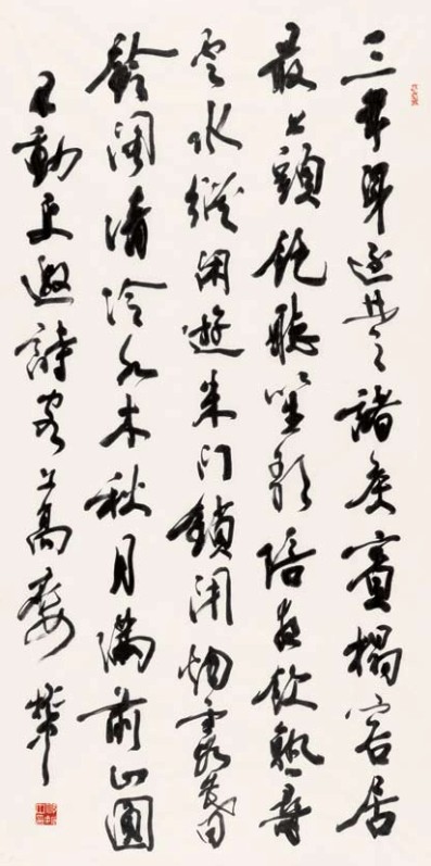 他的传统风格书法作品,单纯坚实的线条和精确的空间构成,显示出他对传统惊人的深入程度。他对传统的体察方式与把握所到达的深度,以及在现实生活中对于这种把握的融会、想象,是中国当代艺术珍贵的收获。