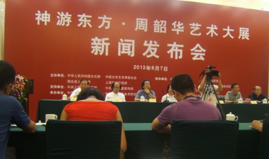 中国国家艺术网讯(钟文 报道):2013年8月7日下午,由中华人民共和国文化部、中国文学艺术联合会、湖北省人民政府、上海市人民政府主办的《神游东方——周韶华艺术大展》新闻发布会在全国政协礼堂金厅隆重举行。发布《神游东方》大展将于9月7日在上海中华艺术宫举行。本次展览是时代大趋势召唤的必然结果,也是举办本次大展的理由:在国家高速成长所带来的全新时代背景中重读和再估周韶华艺术的历史性贡献,探索周韶华艺术在当下语境中所产生的新的意义维度。观众将从这次规模空前,气势恢弘的展览中,感受到中国画在民族伟大复兴路上的脚步声。