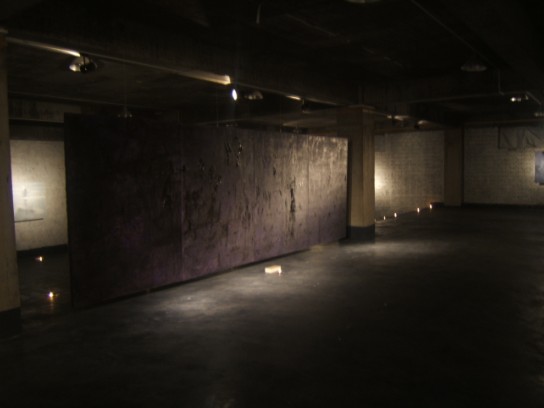 下午3点,上苑艺术馆展览厅外热闹非凡,但当我们走进展览大厅的时候, 出乎所有人意料, 展厅里没有灯光, 只有每个参观者手里的小蜡烛在游荡,借着微弱的烛光我们能隐隐约约地看到作品。此时,一个声音轻轻传来:“不要跟我说话”,声音时断时续,平添了一种神秘气息。突然,所有投向作品的聚光灯一起亮了……