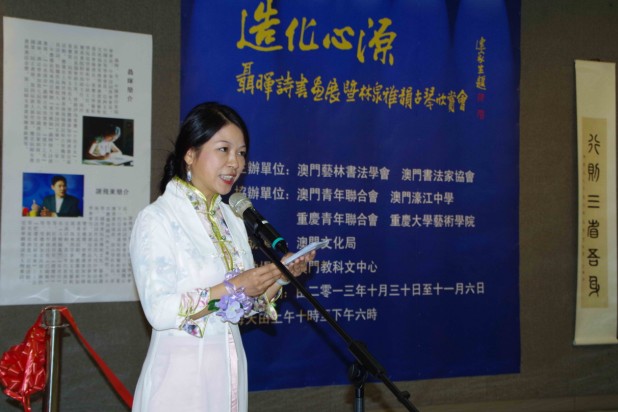 中国国家艺术网讯:著名书画家聂晖应邀于2013年10月30日——11月6日在澳门举行“造化心源——聂晖诗书画展暨古琴欣赏会”。此次展览由澳门书法家协会和澳门艺林书法学会邀请并主办,澳门青年联合会、澳门濠江中学、重庆青年联合会、重庆大学艺术学院协办,澳门文化局及澳门教科文中心赞助,亚洲文化交流学会、中国书画家联谊会支持。澳门书法家协会主席连家生表示,聂晖是一位善于弹奏古琴、创作诗书画印的全才型文人艺术家,她的创作深具个人风格,冀透过展览交流艺术文化,推动中国传统艺术发展。澳門基金會教科文中心主任梁雅桃,澳門青年聯合會會長馬志毅,濠江中學校長尤端陽,美協會長黎鷹,街總榮譽會長吳仕明,港澳台中華文化藝術協會會長李汝匡,澳門書法家協會主席連家生为开幕式剪彩。