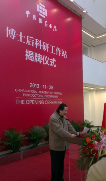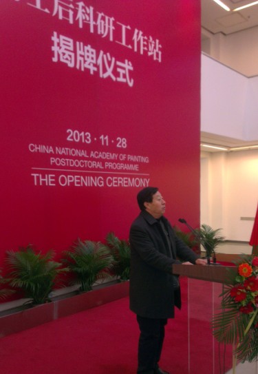 中国国家艺术网讯(陈博秋 报道):2013年11月28日上午11点,中国国家画院“博士后科研工作站挂牌仪式”在中国国家画院美术馆举行,标志着中国国家画院的发展迈上一个新的台阶。人力资源和社会保障部专业技术人员管理司司长、全国博士后管理委员会主任孙建立,中国美术家协会主席刘大为,人力资源和社会保障部中国博士后科学基金会秘书长、留学人员和专家服务中心主任夏文峰,文化部人事司司长张雅芳、文化部科教司副司长王丰,中国国家画院名誉院长龙瑞,中国国家画院院长杨晓阳,中国国家画院副院长张晓凌、曾来德等领导出席了挂牌仪式,并为工作站揭牌。仪式由中国国家画院常务副院长卢禹舜主持。