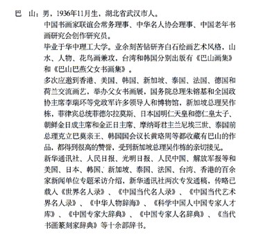 巴山,我国当代著名画家,巴老年近八十,为人低调淡泊,谦虚慈爱;为艺精诚投入,专心致志,巴老可谓是功底、风格、艺德三条标准齐备的优秀画家。作为与刘大为、何家英等已经在拍卖市场上耳熟能详的大师们一样老资格的画家,他的作品虽然从未在拍卖场上出现过,但历年来一直以极高的艺术水准和独特的作品风格受到国内外藏家的喜爱,并被联合国、多国领导人及王室收藏。在美国和东南亚,巴老的作品可称得上一画难求,一虾千金。