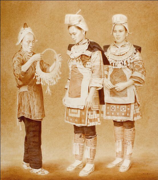 Ye Xiangming is famous for subtle and realistic minority national feelings that made him awarded. However, he gave up the smoothly common road and insisted on his dream. He came back to himself, his heart and his dream. Thus his drawing style changed much: elegant, depressed, recollecting, as a lonely chanter walking in a field resolutely to the end, where there is a girl thinking and waiting for the final visitor sadly.