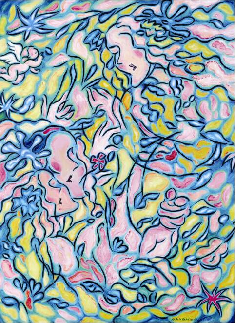 客观而言,如果一个艺术家很真诚地进行创作的话,那么他的作品就是他的自传,就凝聚着他的个人经验,反映着他的生活方式和思想方式。叶向明亦是这样的例子。当他蓝调系列作品中表现出那类苦闷忧郁的主题时,实际上他也经历了自己内心痛苦的裂变;当他的情绪趋向平缓时,其蓝调抽象作品中亦显然流露出安详平静的气氛。尤为值得注意的是,隐约可辨的心形、花形、小天使等形象是叶向明在寻求作画时的个人情感的象征表露,其带有隐藏的象征性,那种梦幻般的单纯与平静是对成人世界的一种否定和逃避,也正如他作画时的态度一样,在一种超然的心态中向人的本性回归。