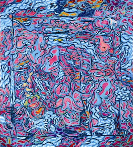 叶向明的作品,有时又呈现了另一种较为安详的面貌,那是以玫瑰红和橙红为主色调的,靛蓝则是退居次要之地位,但线条仍以深色为之,不脱蓝调本色。这一类的作品揭示了另一种意象,线条肌理较为匀称,比较强调一种平面性的画面效果。