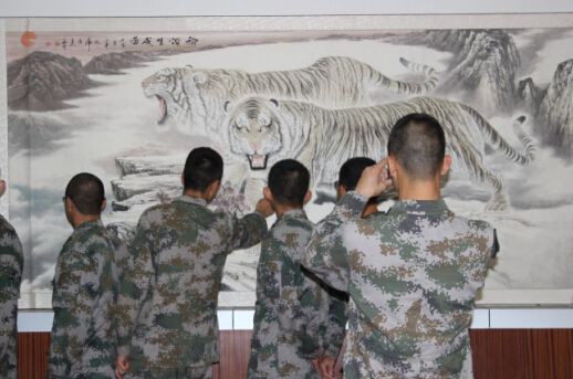 本次展览展出的均为王华峰先生创作的“壮军威、强国梦”系列工笔虎作品,“壮军威、强国梦”系列作品是王华峰先生根据习近平总书记“壮军威、强国梦”指示精神,以工笔虎画为载体,紧紧围绕部队建设为主题创作的一系列精品力作,以虎喻军、以画托志,把军人与猛虎、军队与长城,用暗喻的手法在生宣上表现,把军人与军队的性质、宗旨、作用,在宣纸上表现的淋漓尽致。生动反映了国家军队建设的伟大成就以及人民子弟兵保卫祖国的信心和决心。