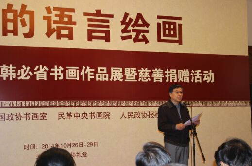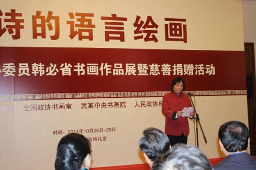 中国国家艺术网讯(钟文 报道):10月26日下午,“用诗的语言绘画——全国政协委员韩必省书画作品展”在全国政协礼堂隆重开幕。此次展览由全国政协书画室、民革中央画院和人民政协报社共同举办。开幕式上,韩必省向中慈国际交流中心和中国下一代教育基金会捐赠了绘画作品。