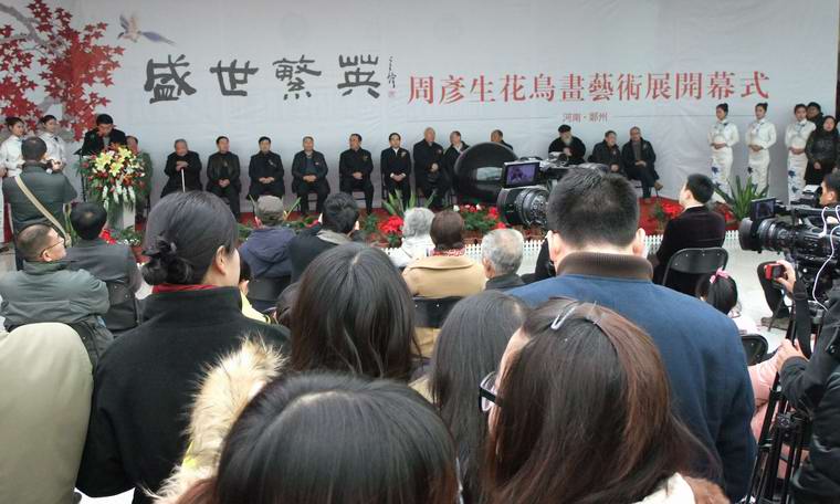 中国国家艺术网讯:2014年12月6日,由河南省委宣传部、河南省文联、恒大地产集团联合主办,河南省美协、河南省美术馆、河南省书画院、周彦生艺术研究院共同承办的“盛世繁英——周彦生花鸟画艺术展”在河南省美术馆隆重开幕。河南省政协副主席靳克文,原河南省人大副主任李柏栓、王文超,原河南省政协副主席王平,原河南省武警总队总队长曹云中,河南省委宣传部常务副部长王耀,河南省委组织部副部长、河南省人社厅厅长杨盛道,河南省文联党组书记吴长忠,原河南省委政研室巡视员刘本在,河南省美协名誉主席王威,河南省美协顾问李自强、丁中一、河南省美协副主席、河南省书画院院长谢冰毅等相关领导和嘉宾出席了此次开幕式,开幕由河南省美协副主席兼秘书长刘杰主持。在开幕式上河南省美术馆党委书记高岭代表河南省美术馆接受周彦生先生捐赠作品。此次展览是继今年9月由中国美术家协会、中国国家博物馆、河南省委宣传部、广州美术学院等单位共同主办的“盛世繁英——周彦生花鸟画艺术展”在中国国家博物馆展后,周彦生为家乡人举办的一次汇报展出,共展出周彦生近20年来创作的200余幅花鸟画。