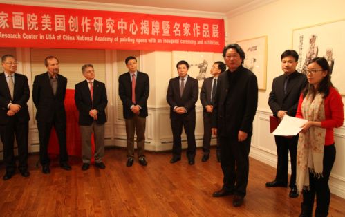 中国驻纽约总领事馆文化参赞王燕生,中国国家画院副院长张江舟,《美国艺术》杂志社主编、中国国家画院研究员Richard Vine,美国艺术家协会主席Thoms Valenti,美国纽约邮报董事长Hoffen Berg,美国中国文化艺术基金会主席朱瑞凯,中国国家画院研究员张立柱共同为中心揭牌,活动由中国国家画院海外推广办公室主任翟优主持。美国大都会艺术博物馆亚洲部主任、中国国家画院研究员孙志新,联合国中国书会会长温学军,纽约历史博物馆董事Bob Lineberg,美国艺术家Meye Uranovsky,美国威廉帕特森大学中国艺术中心主任、教授丛志远,中国银行纽约皇后分行行长任文军等及中美友人100余人见证了这一时刻。