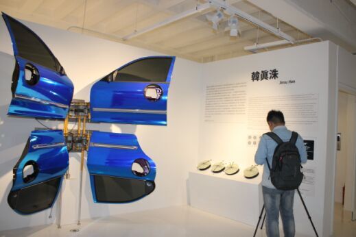 韓眞洙的作品《飞》像是记忆之门的开合一如蝴蝶翅膀的扇动,带着些许乡愁,一如旧时玩具。作品《门钟》是用车身上切割下的一块金属板做成的一台数码闹钟,象征着过往与当下的记忆循环机制。