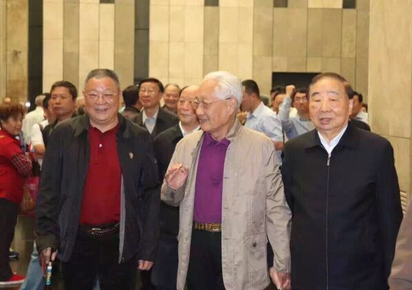 魏镇(左一)与专程参观展览的原江苏省委书记陈焕友(右一)、原南京军区政委方祖岐上将(中)合影