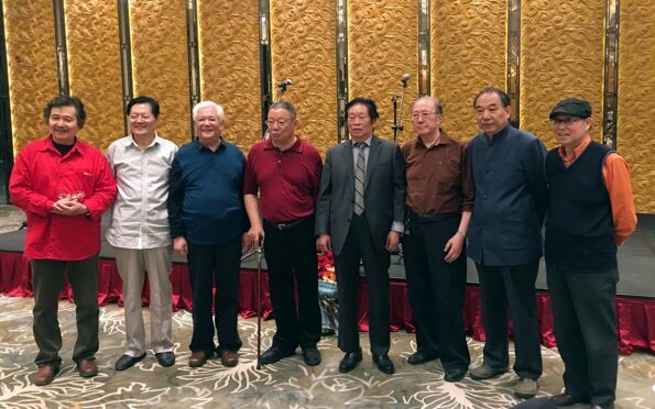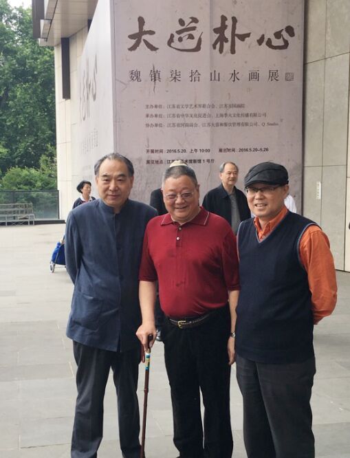 魏镇(中)与专程参观展览的原江苏省美协主席宋玉麟(左一)、原江苏省傅抱石纪念馆馆长徐善(右一)合影