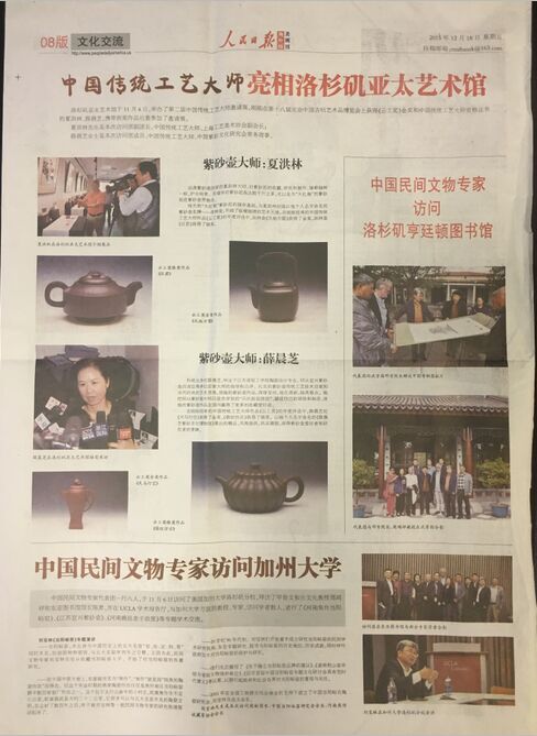 人民日报海外版美洲版刊登的题为《中国传统工艺大师亮相洛杉矶亚太艺术馆》的专版报道,在国内的中国传统工艺大师评委界与中国传统工艺大师群体中产生了极好的影响。