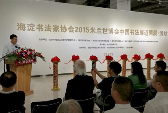 9月20日上午九时三十分,“意大利米兰世博会中国书法展返国展·潍坊”在潍坊秋磁美术馆开幕,本次展览由北京市海淀区文学艺术界联合会、海淀书法家协会、潍坊市文学艺术界联合会、潍坊市书法家协会、潍坊市潍城区文学艺术界联合会、潍坊市潍城区潍州书法家协会联合主办,潍坊秋磁美术馆承办,潍坊市潍城区美术家协会、潍坊市潍城区企业家联合会、山东普兰集团协办。书展的举办,推进了潍坊、北京两地文化艺术交流。