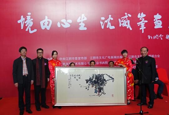 画展开幕式上,江阴市副市长龚振东接受了南京书画院花鸟画研究所所长沈威峰向江阴市博物馆捐赠的《纵横捭阖结琳琅》作品。