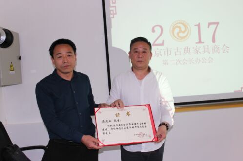 北京市古典家具商会会长邬涛为钟文颁发任命书