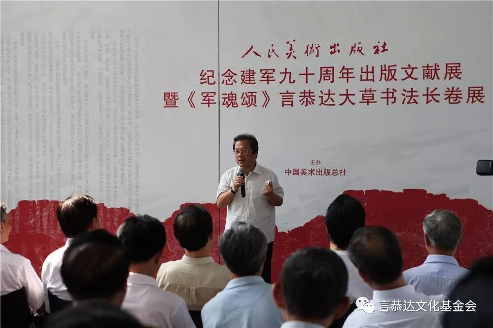 昨天这个展览的主办方说一定希望我在这里说两句,早晨给我一个稿子,我一看,非常重要,事关这个展览的宗旨和意义。所以,我得认真的传达给各位一一1927年8月1日南昌起义的一声枪响正式宣告了人民军队的诞生。为了民族的独立,为了民族的解放,一代军人前赴后继,死而后已。今年是中国人民解放军建军90周年,现在习总正带领我们军队在进行检阅,非常隆重的仪式。在建军的今天,人民美术出版社举办这场建军九十周年出版文献展暨《军魂颂》言恭达大草书法长卷展活动,具有特殊的意义,人民美术出版社是国家级的美术专业出版社。成立于1951年,至今已经走过了66个春秋,成为新中国成立最早的中央级出版社之一。作为新中国美术出版事业的发源地,人民美术出版社迄今已经出版了数万册美术类图书,为我们出版和文化事业做出了杰出的贡献。图画和文字作为文化传承的重要载体,可以直观的反映出当时的历史进程和时代特征。