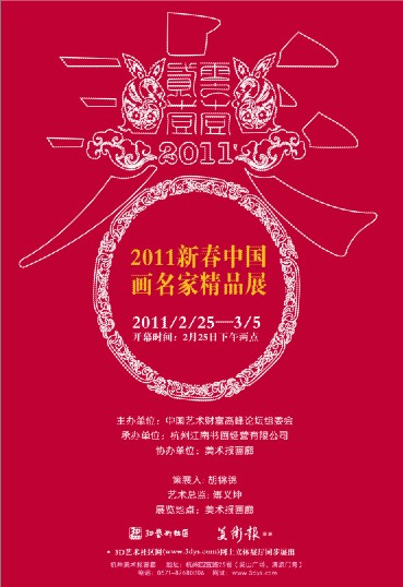 虎振雄风留浩气、兔迎盛世蔚新春。2011新春之际,由中国艺术财富高峰论坛组委会主办、杭州江南书画经营有限公司承办、美术报画廊协办的“2011新春中国画名家精品展”将于2011年2月25日在美术报画廊举行,此次展览作为2月26日即将举办的浙商艺术财富俱乐部成立大会的主题展览,共展出中国书画名家精品39幅,是主办方从数十位具有代表性的中国书画名家中精选出来的艺术精品。其中大部分作品是“春雨江南——浙派中青年国画家提名展”的展览原作,该展览荣获文化部“中国现当代艺术重点推广项目”,具有很高的投资和收藏价值。